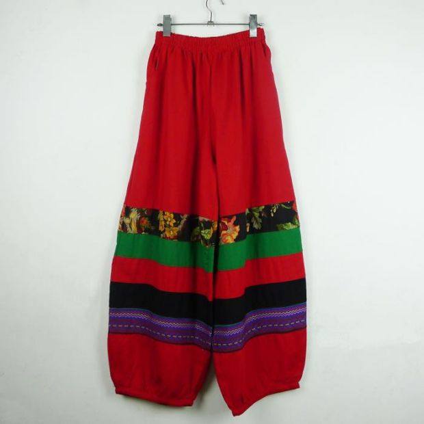 灯笼裤舞蹈长裤厚棉麻彩道拼接宽松款口袋民族风女装大码松紧腰