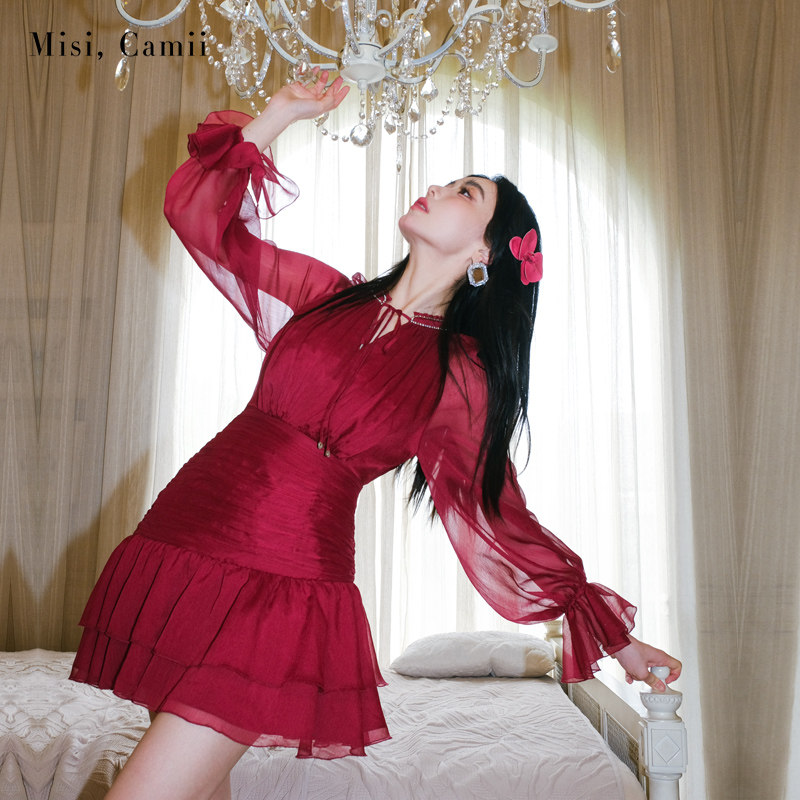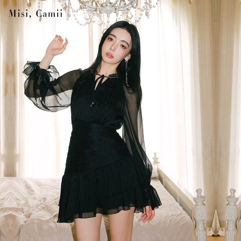 Misi.Camii2024夏季新款女装斜边荷叶摆缩褶连衣裙轻奢时尚感小众