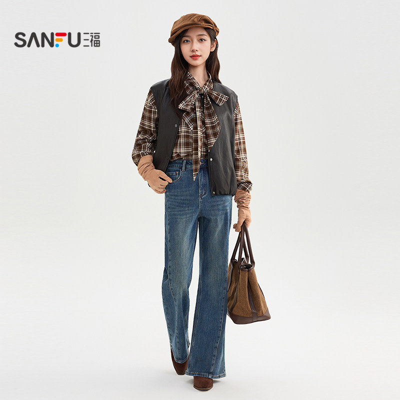 三福牛仔长裤2025新款冬季磨毛阔腿裤复古深色宽松裤子女装512304