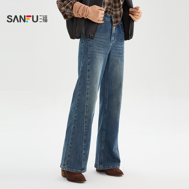 三福牛仔裤2025新款冬季都市磨毛内里复古蓝色喇叭裤子女装513039