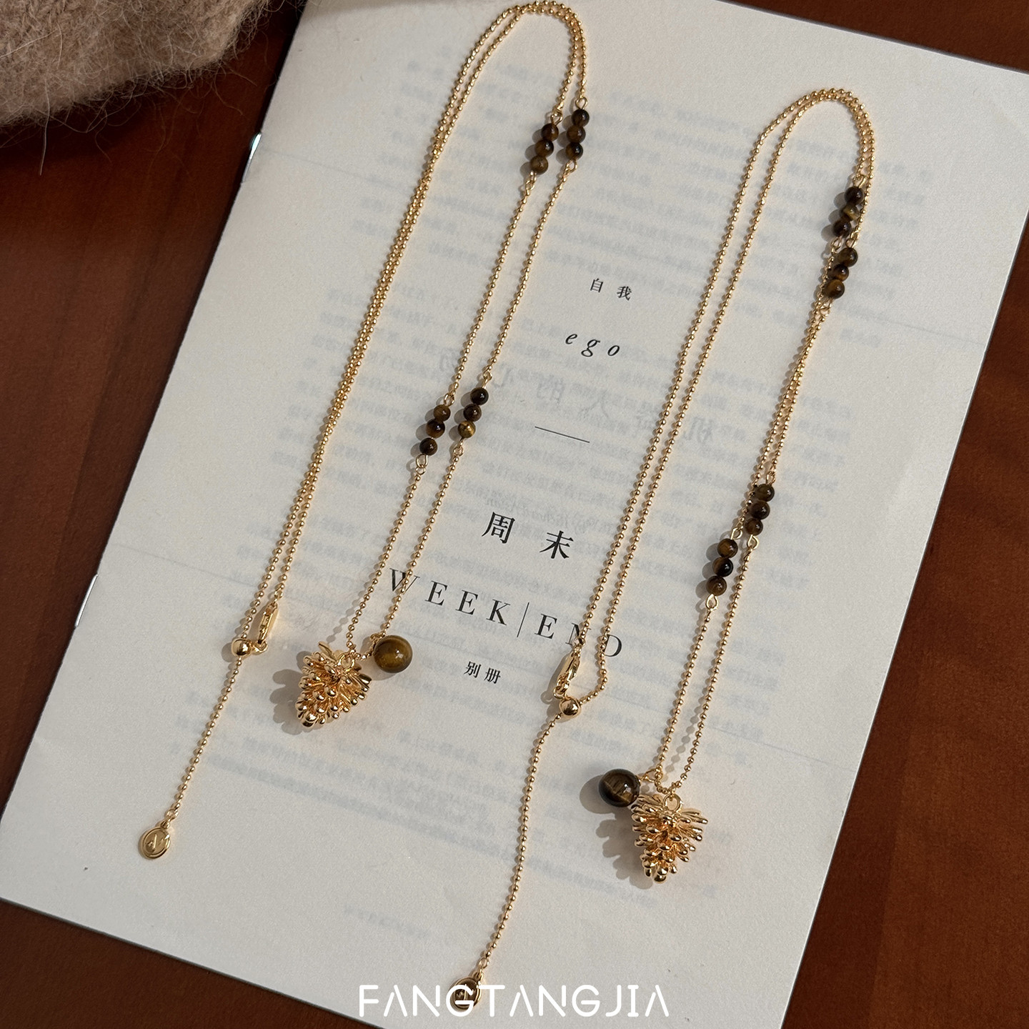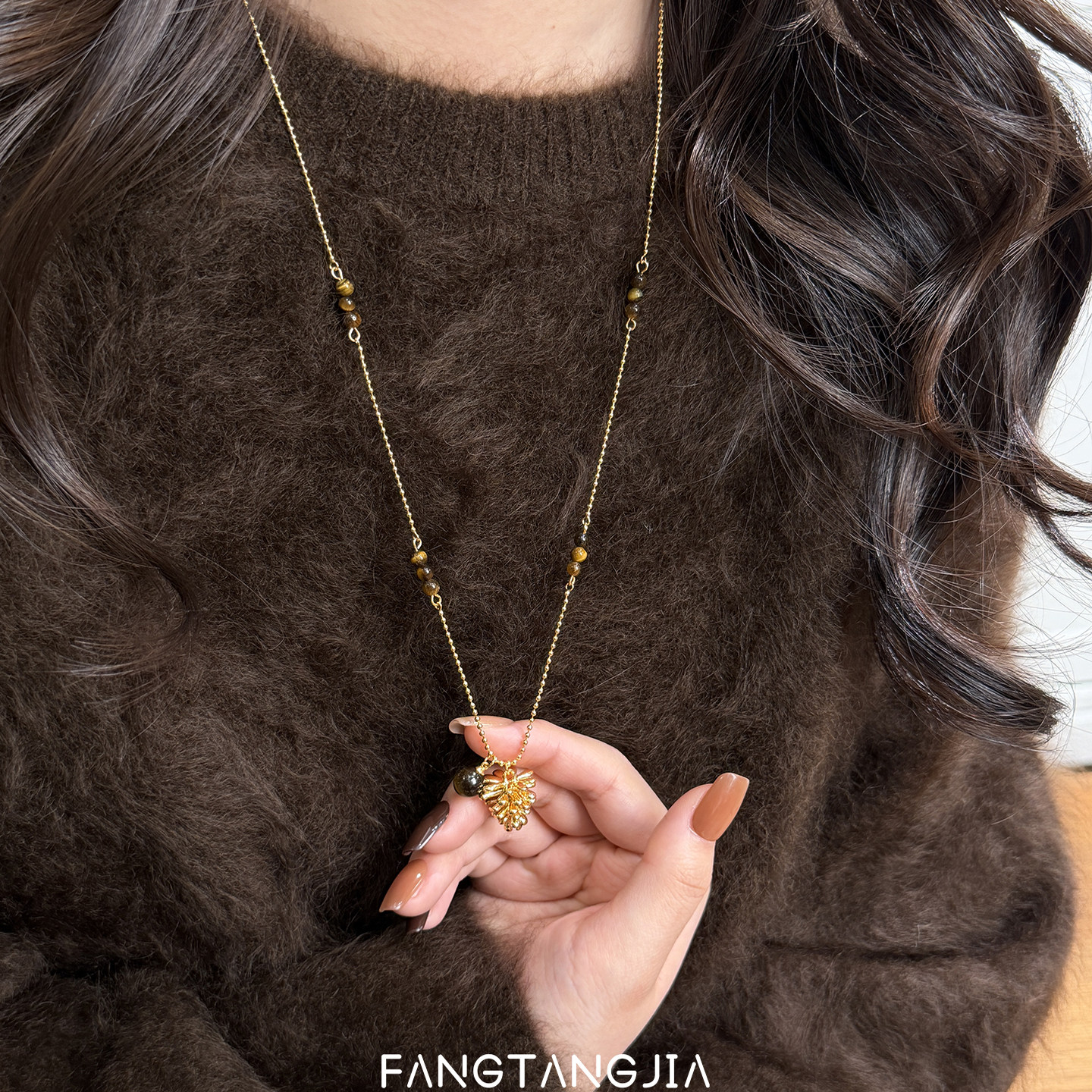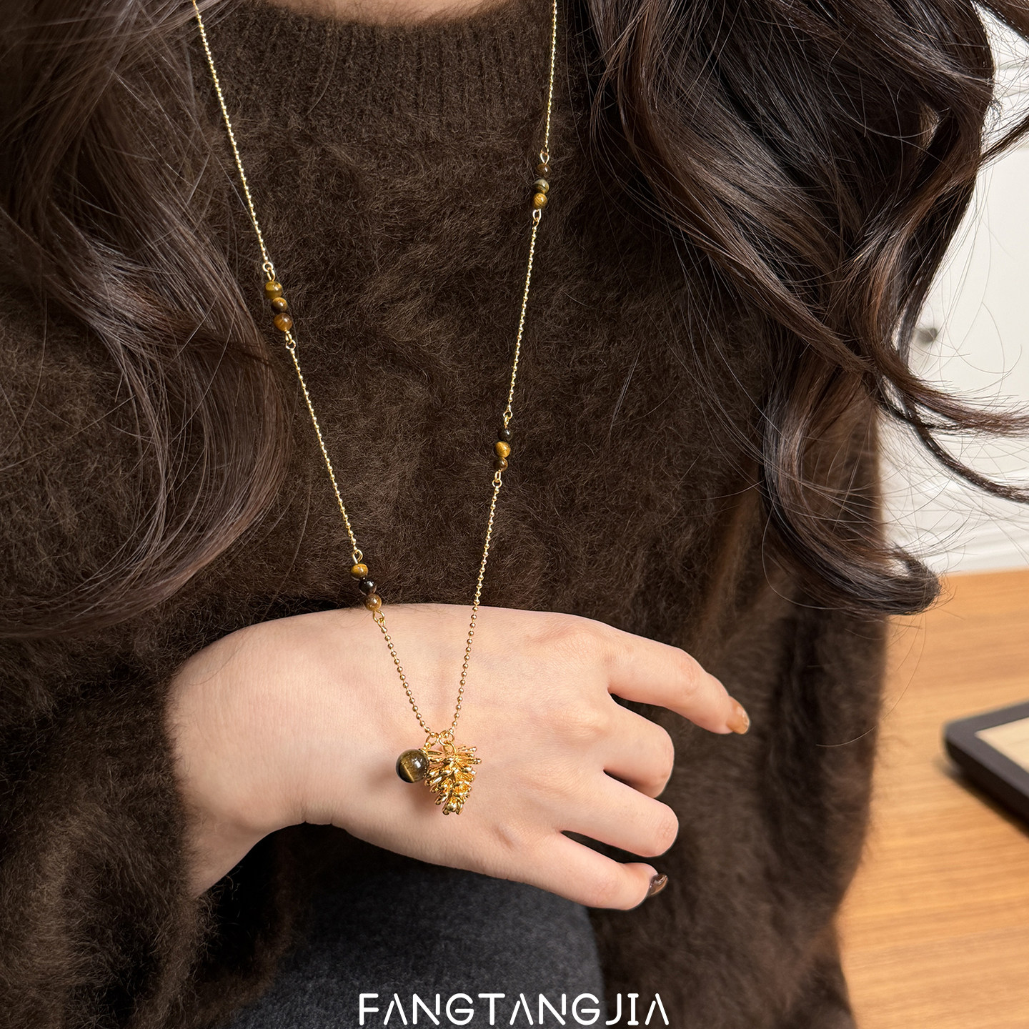 秋冬复古松果吊坠仿虎眼石项链配饰美拉德轻奢高级感长款毛衣链