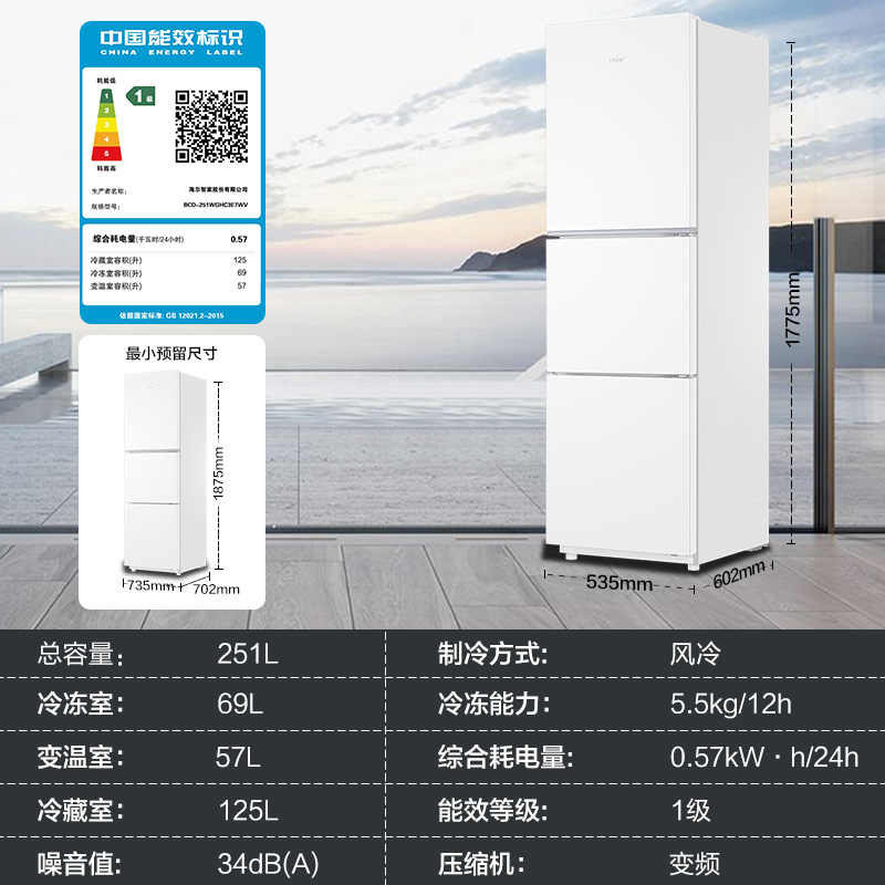 海尔251L家用小型电冰箱三开门风冷无霜一级能效双变频出租房宿舍