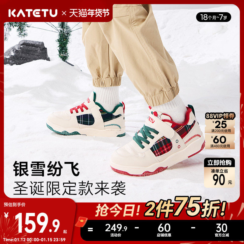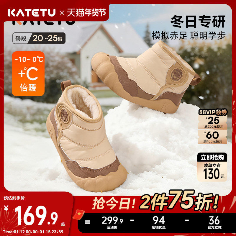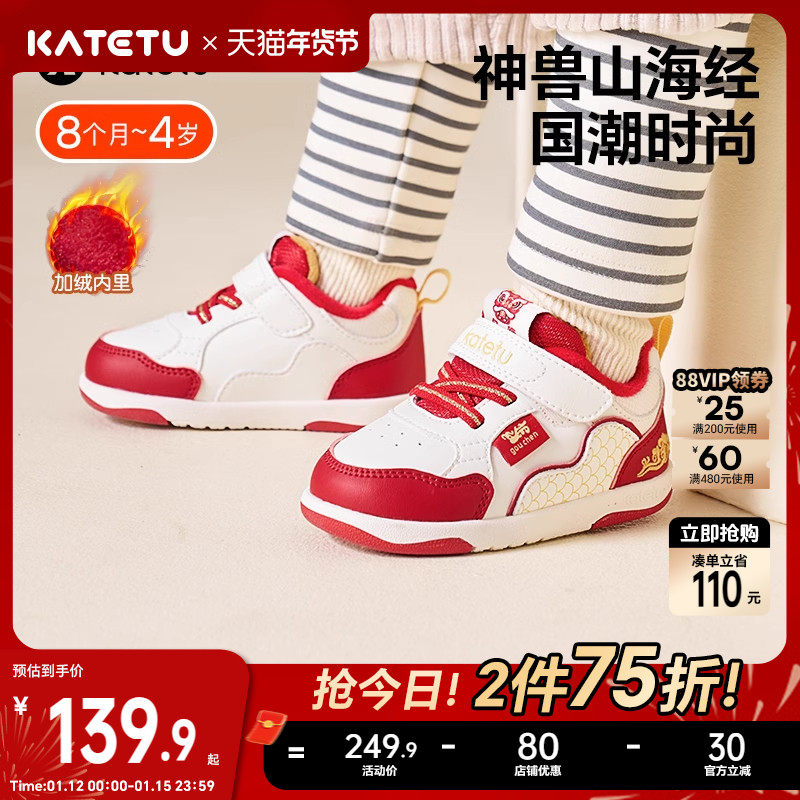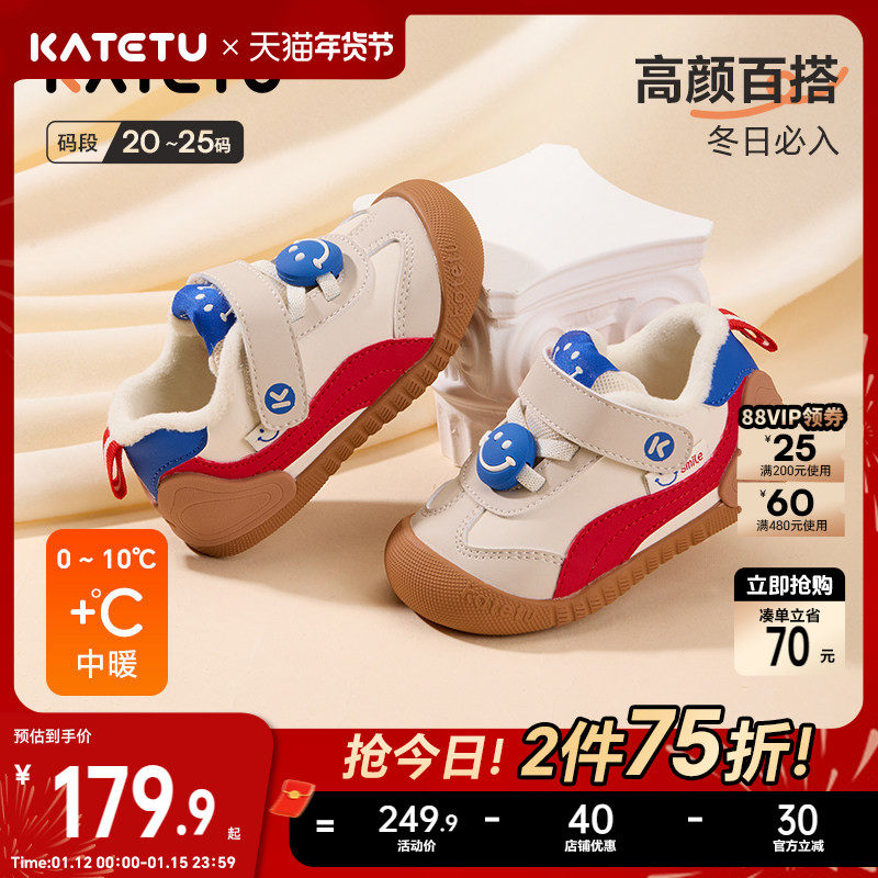 卡特兔学步鞋宝宝新款鞋子加绒保暖板鞋儿童棉鞋新年男童女童