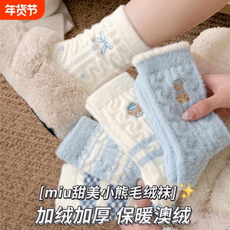 蓝色小熊澳绒袜子女秋冬厚保暖中筒袜条纹蝴蝶结居家睡眠月子