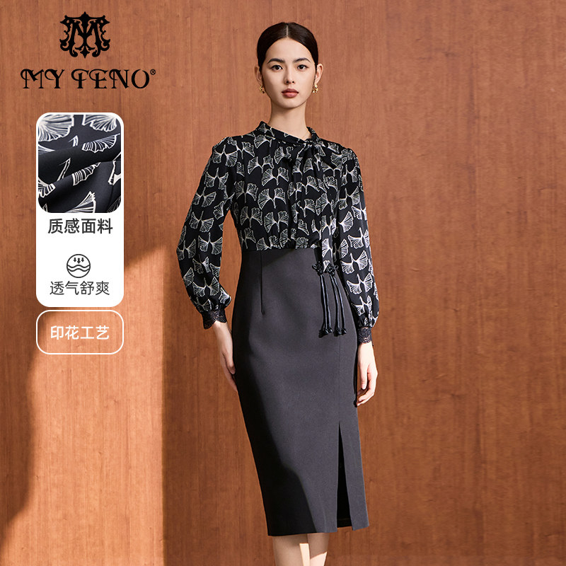 专柜正品马天奴女装秋冬黑色印花V领衬衫连衣裙子时尚气质流