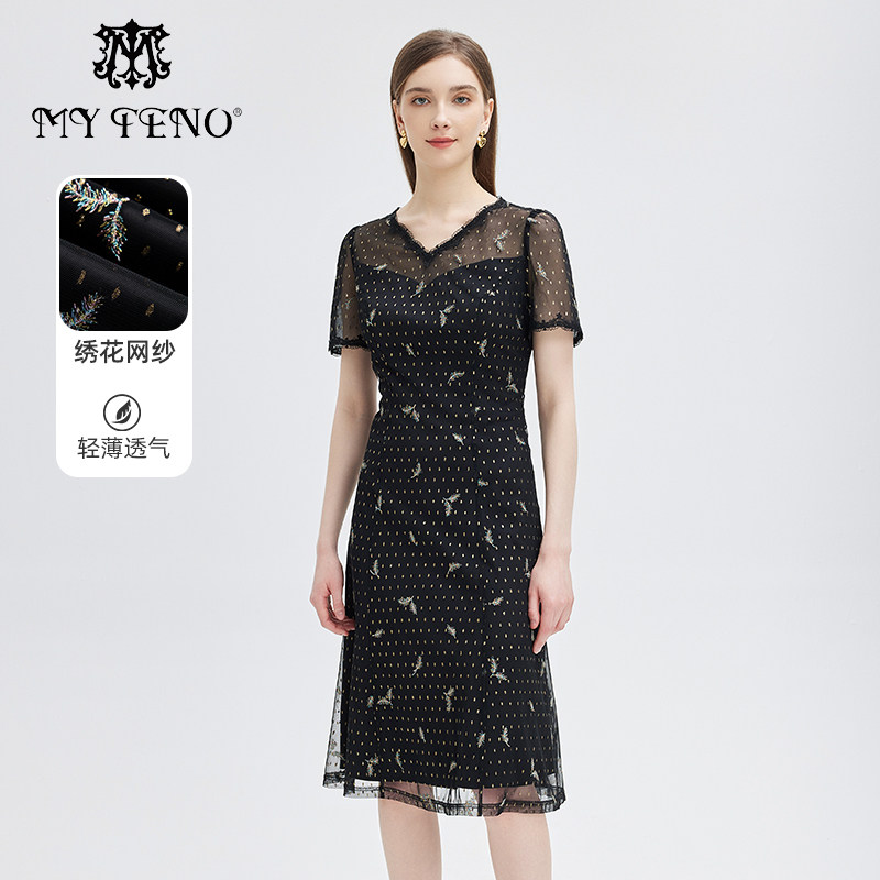 专柜正品马天奴女装春夏新款黑色V领波点刺绣网纱连衣裙裙子