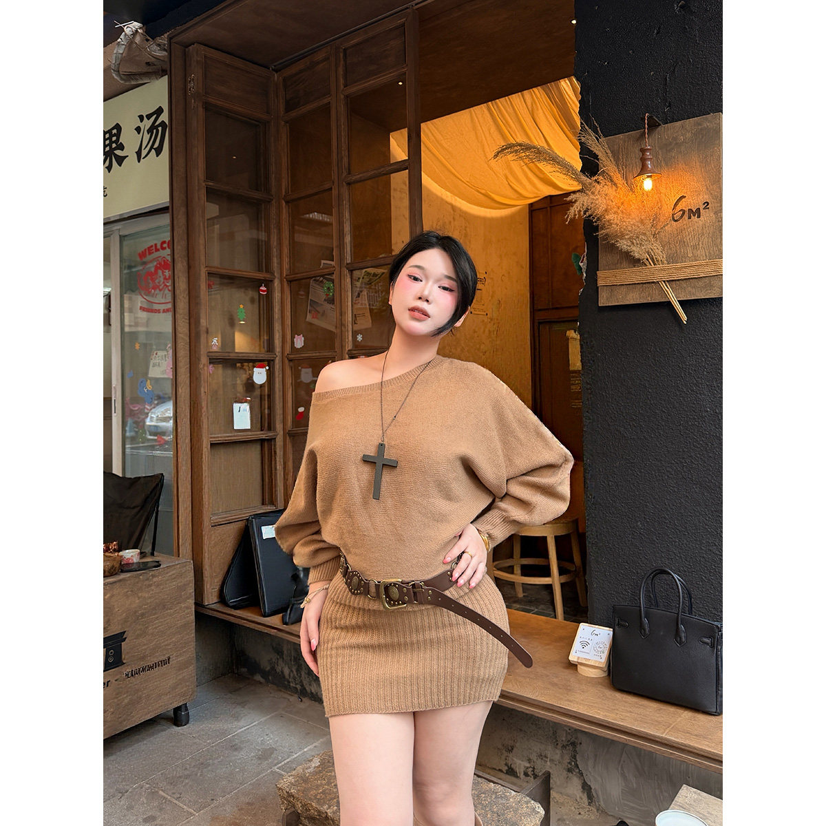 姜姜【美式女孩】 微胖大码女装斜肩裙子秋冬新款收腰显瘦连