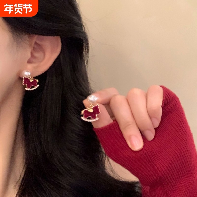 新年红色丝绒小马珍珠耳环女2026新款独特漂亮耳钉气质银